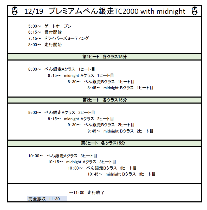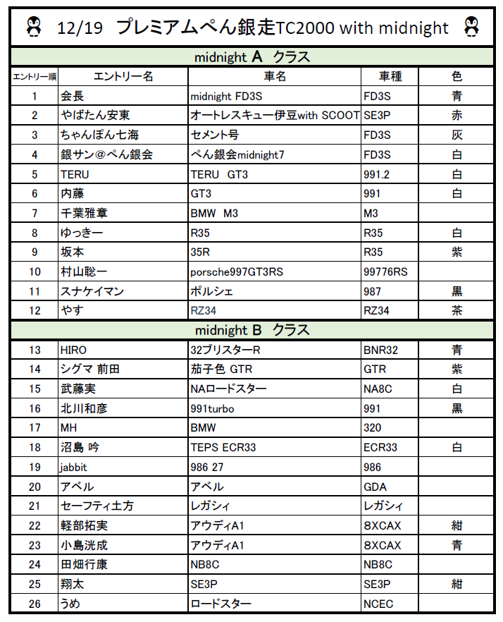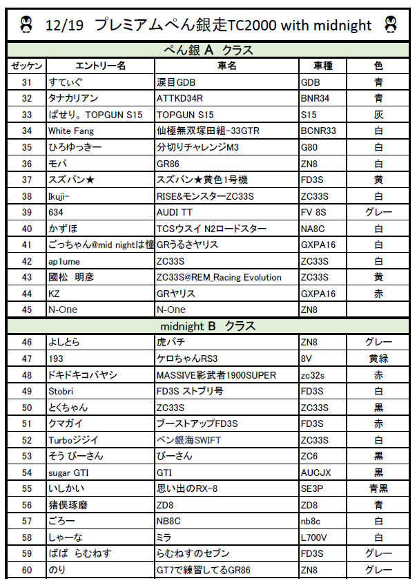 midnight 1クラス、midnight 2クラス、ぺん銀走Aクラス、ぺん銀走Bクラス